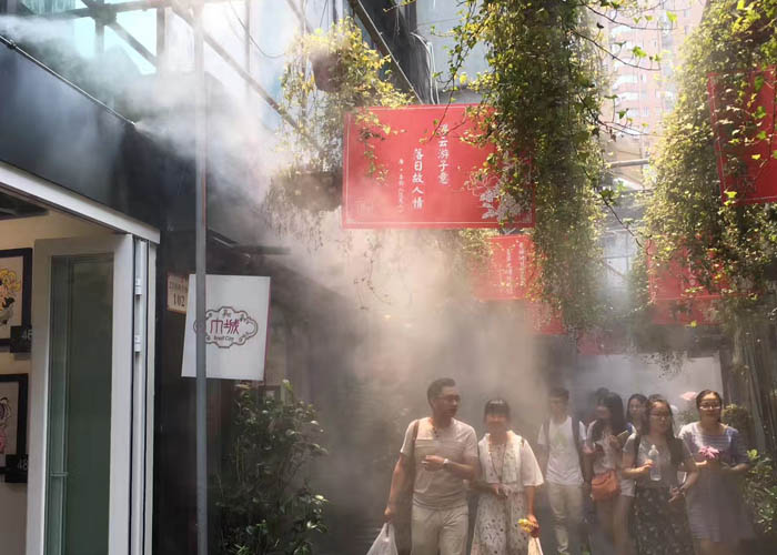 作為上海的3A景區(qū)之一,田子坊每天都人頭攢動(dòng),連日高溫讓許多游客不能細(xì)細(xì)品味老上海的弄堂風(fēng)情。為此,管委會(huì)采用了綠友集團(tuán)自行研發(fā)制造的GREENMAN造霧系統(tǒng),200多個(gè)噴頭每小時(shí)噴霧三次,每次噴霧2分鐘,配合弄堂兩邊墻壁種植的綠化,不僅美化了街景,更對(duì)降低整個(gè)田子坊的溫度起到了有效的作用。現(xiàn)場(chǎng)溫度計(jì)顯示,不進(jìn)行噴霧的弄堂溫度是36 攝氏度,噴霧后,弄堂溫度顯示33攝氏度,最低的地方溫度甚至降到28攝氏度,降溫明顯。