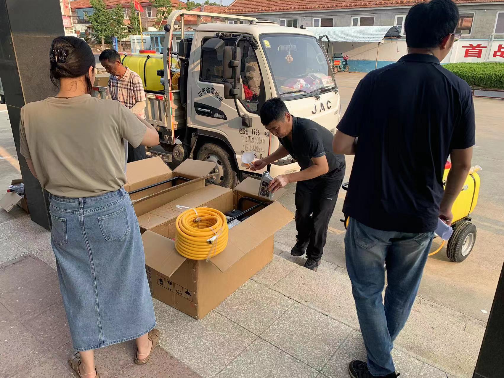 工具到貨,為盡快完成供貨,濰坊綠友的同事們一件件、一箱箱卸到庫房,根據每個鎮的需求,按型號按數量分裝、核對,為打藥機加注機油以便客戶使用。汗水模糊視線、打濕衣襟,卻毫不影響同事們的工作勁頭。