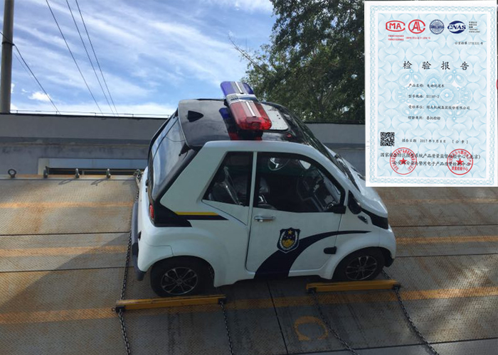 9月8 日, 綠友集團自主研發的GREENMAN 兩座巡邏車順利通過“公安部安全與警用電子產品質量檢驗中心”型式試驗認證。取得該認證后,綠友兩座巡邏車可以合法地使用警徽等警用標志。該認證要求較高,綠友車輛以優異的性能一次性通過。為了提升GREENMAN 巡邏車在公安、武警、消防等行業的市場競爭力,我公司委托國家安全防范報警系統產品質量監督檢驗中心和公安部安全與警用電子產品質量檢測中心,針對GREENMAN 兩座巡邏車的主要技術參數、制動性能、車外噪聲、側傾穩定性、轉向性能、控制設備絕緣電阻、線束、專用接線盒、續駛里程、防雨密封性,防火要求等項目進行了檢驗測試,所有檢驗項目均符合檢驗標準要求,最終檢測結果證明了GREENMAN 兩座巡邏車質量的可靠性。