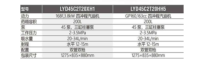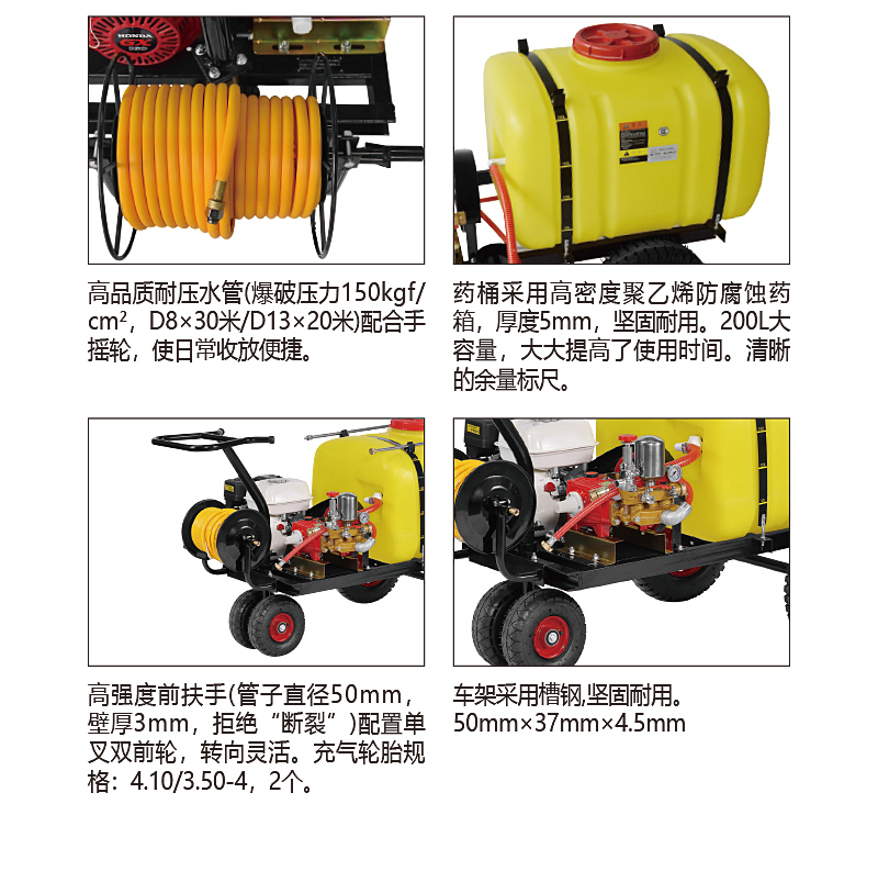 高密度聚乙烯防腐蝕藥箱,藥箱上配有刻度藥量顯示,及時(shí)掌握藥液噴灑情況;靈活可轉(zhuǎn)動(dòng)的前扶手設(shè)計(jì),轉(zhuǎn)向靈活;單叉雙前輪設(shè)計(jì),前輪直徑255mm;雙管雙槍:高壓槍,霧化槍各1套, 高壓水管:D8×30m ,D13×20m