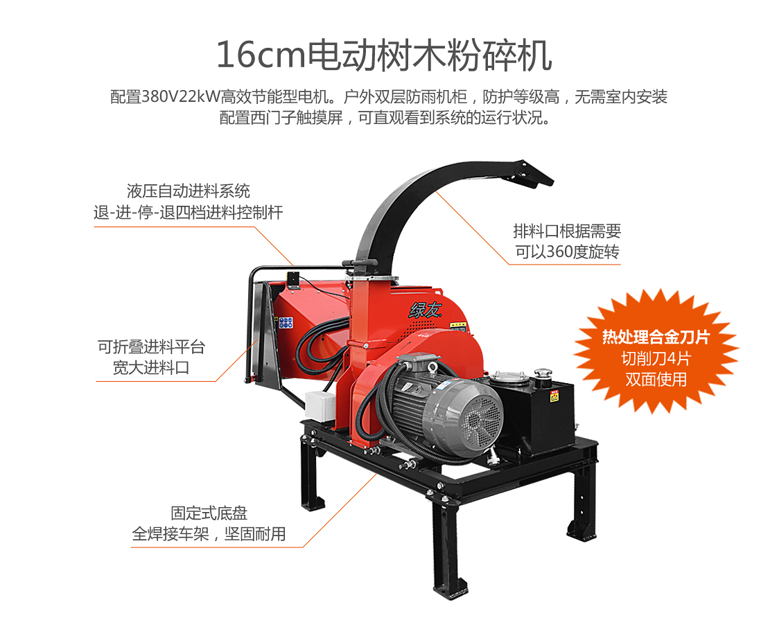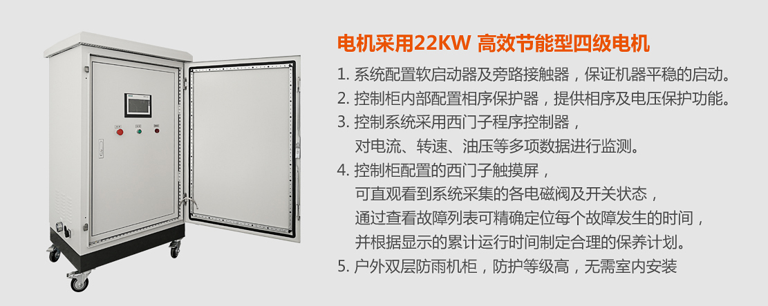 16cm電動(dòng)粉碎機(jī),配置380V22kW高效節(jié)能型電機(jī)。戶(hù)外雙層防雨機(jī)柜,防護(hù)等級(jí)高,無(wú)需室內(nèi)安裝;配置西門(mén)子觸摸屏,可直觀看到系統(tǒng)的運(yùn)行狀況。